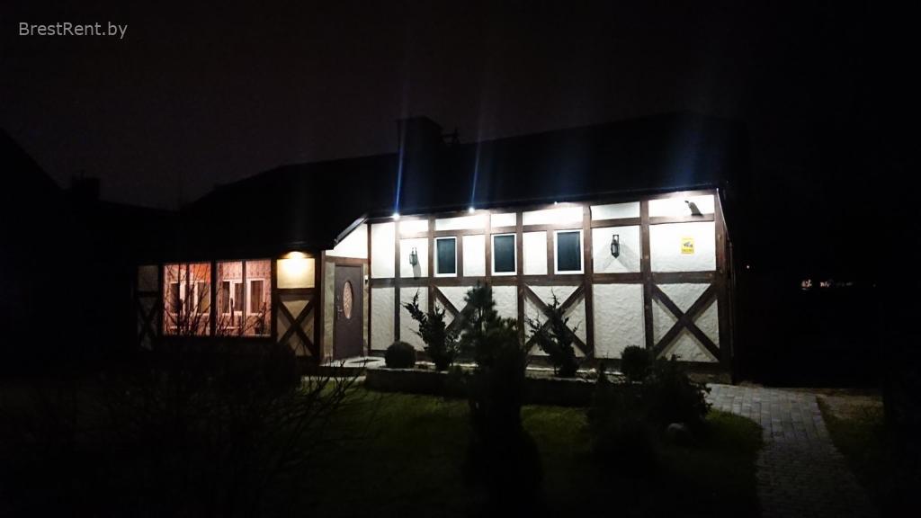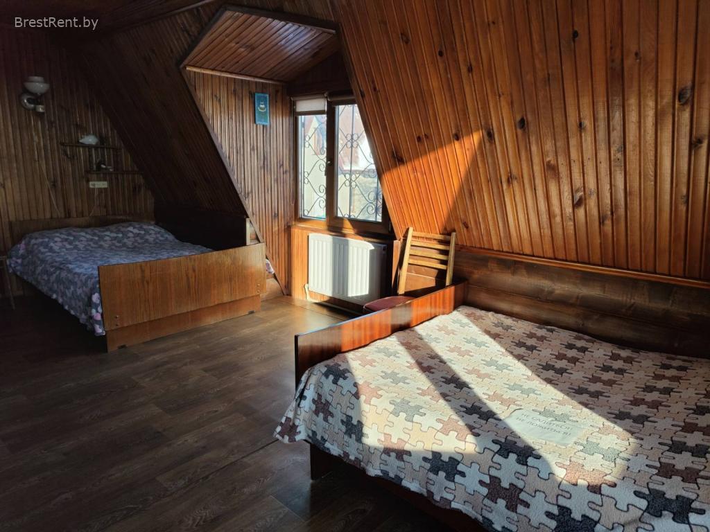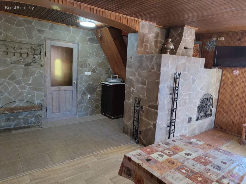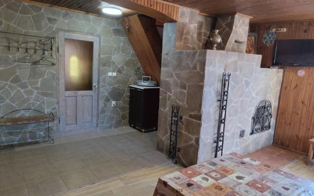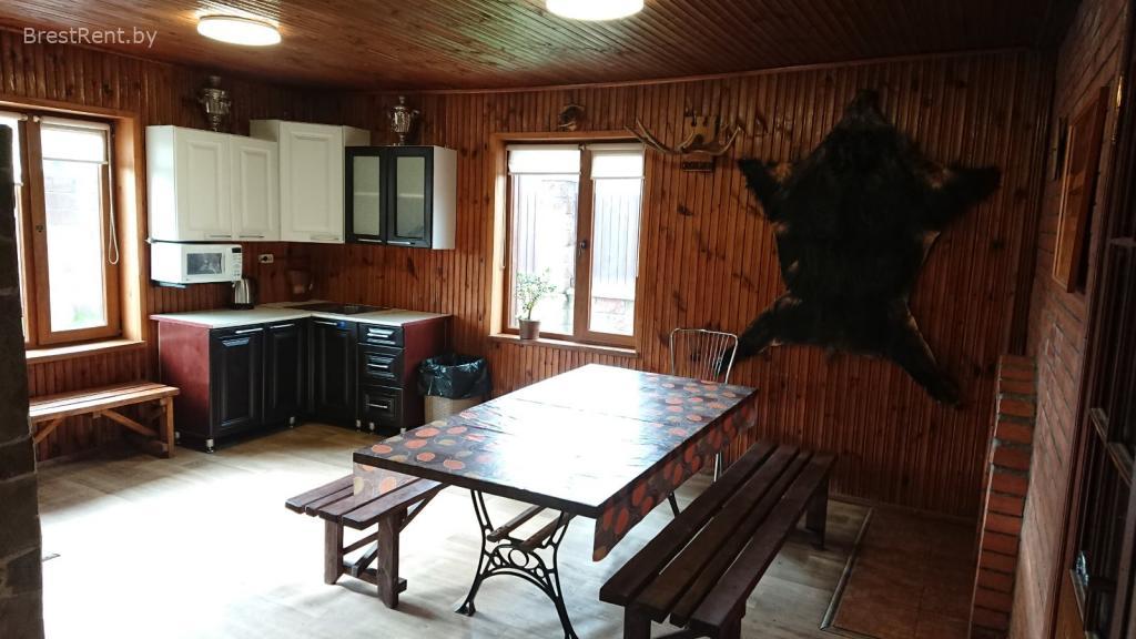 На первом этаже прихожая, санузел, сауна, душевая и комната отдыха. Комната отдыха с большим столом на 10 человек. Мини кухня с минимальным набором посуды на 8 персон. СВЧ печь, электрический чайник, холодильник, ВТ колонка, Wi-Fi,телевизор, радио. Интерьер в стиле охотничьего домика. На втором этаже спальные места. Всего 8 спальных мест (2+2+2+2).